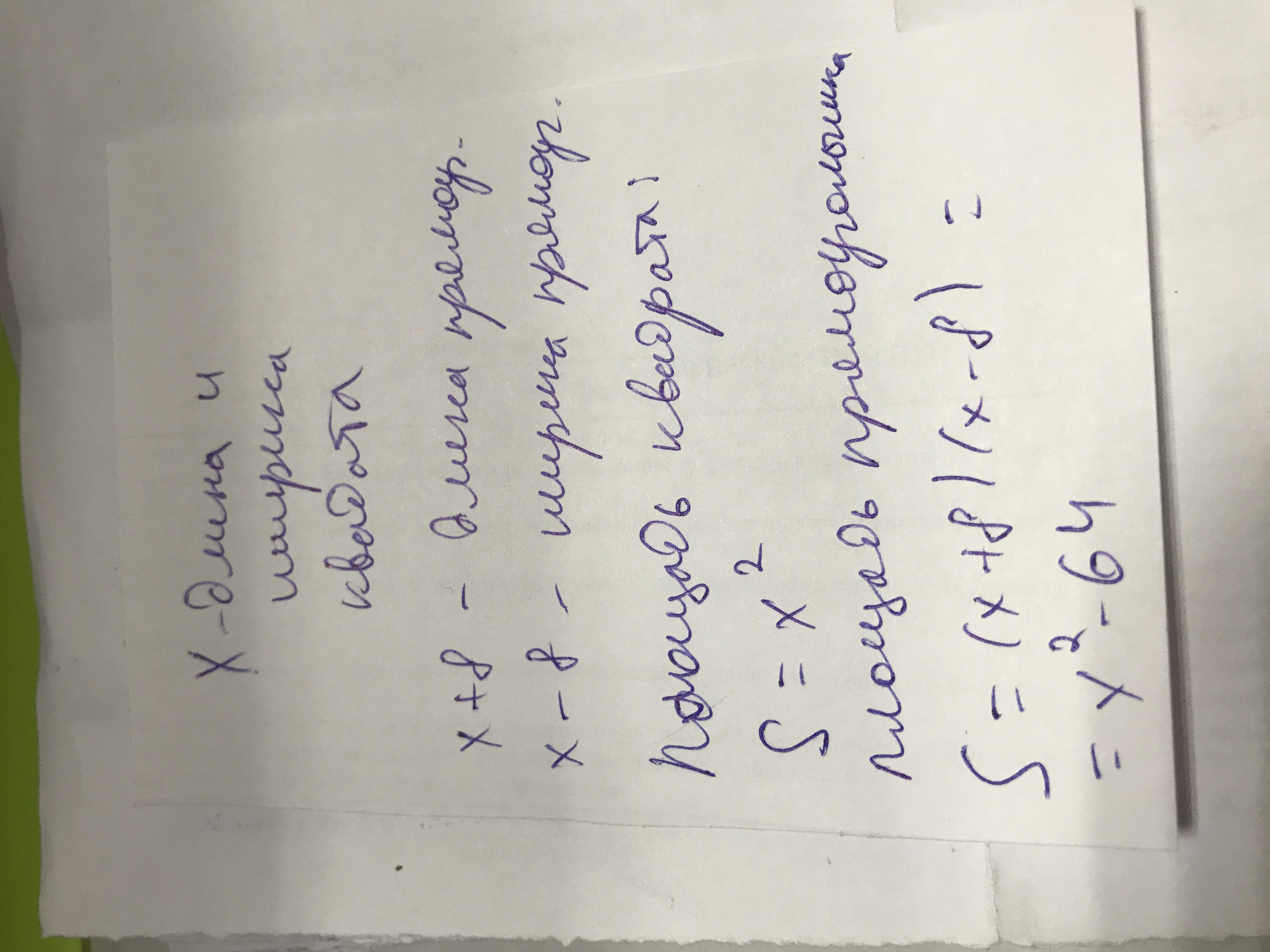 Длина прямоугольника на 8см больше стороны квадрата , а ширина - на 8см меньше.У какой из фигур площадь больше и на сколько?