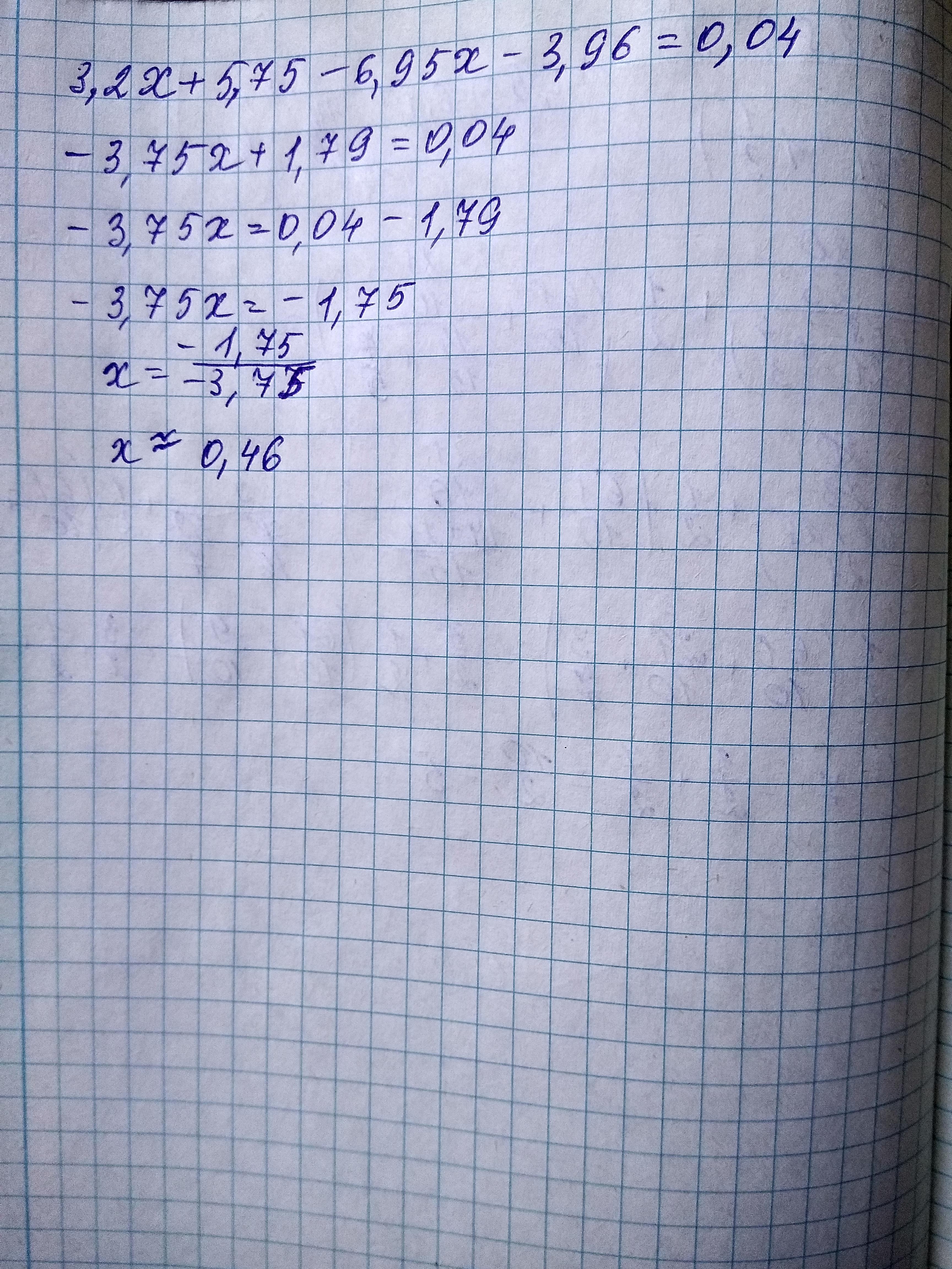 3,2х + 5,75 - 6,95x - 3,96 = 0,04