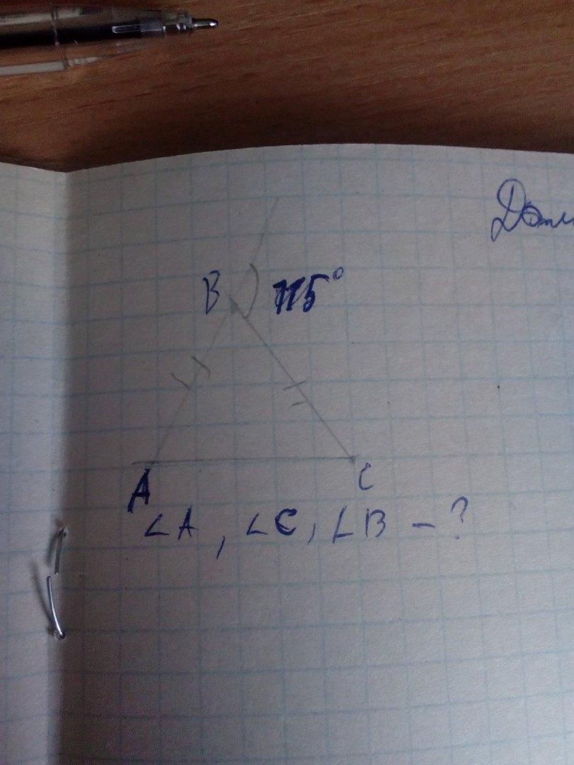 3) 115 : 2 = 57,5° (∠А=∠С, так как они углы при основании равнобедренного треугольника)