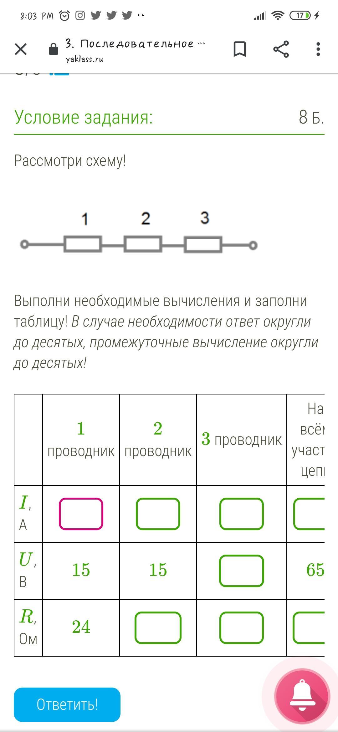 I 1= 0,6 I 2=0,6 I 3= 0,6 I общее= 0,6 , U 3= 35; R 2= 24, R 3= 56; R на участке цепи= 108,3