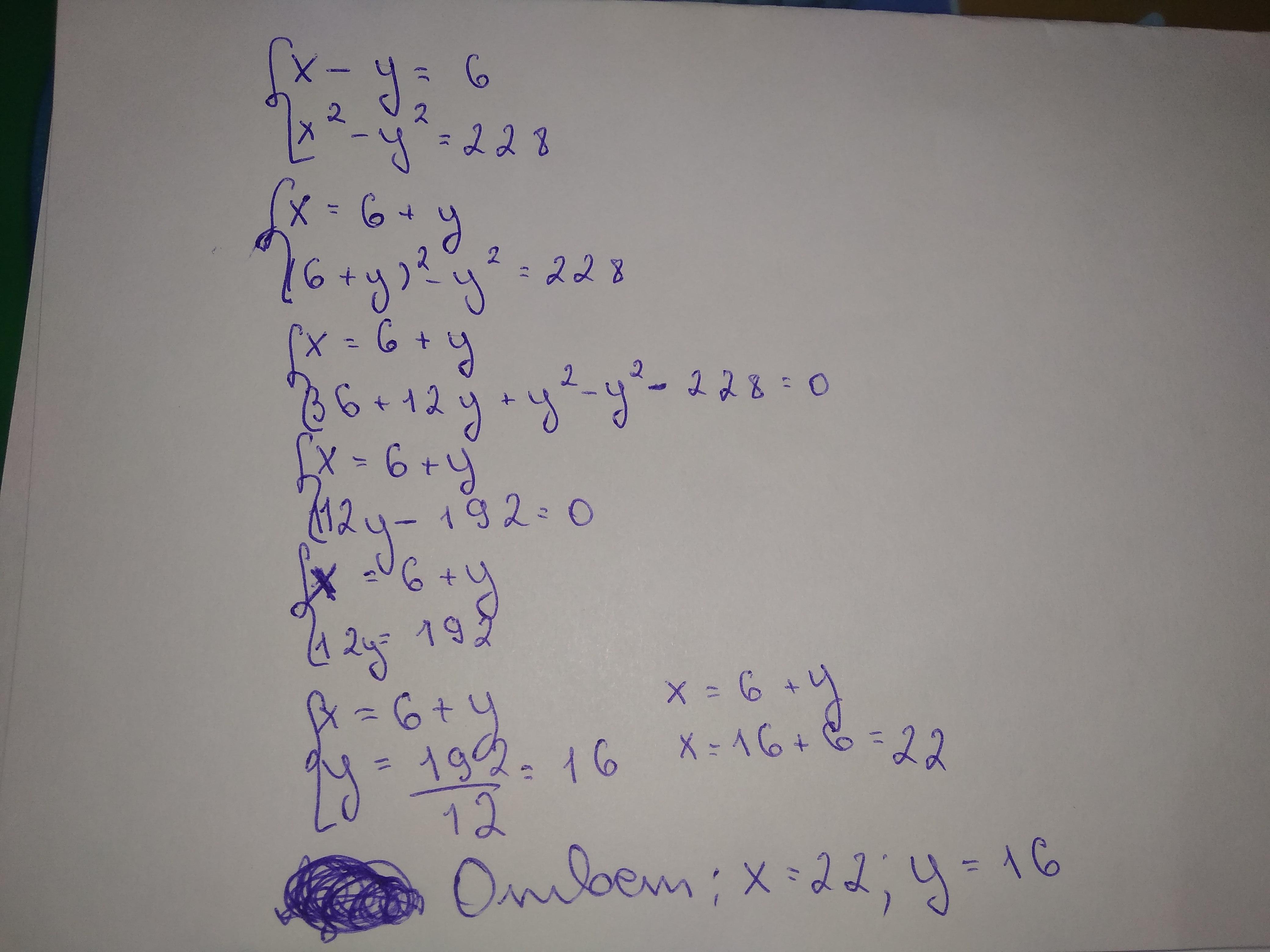 решите задачу с помощью составления системы уравнений.разность двух чисел равна 6, а разность их квадрата-288.найдите эти числа