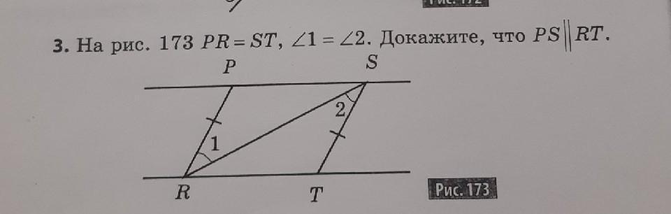 тк pr=st, a ∠1=∠2 ⇒ rpst параллелограмм (по свойству параллелограмма) ⇒ ps║rt