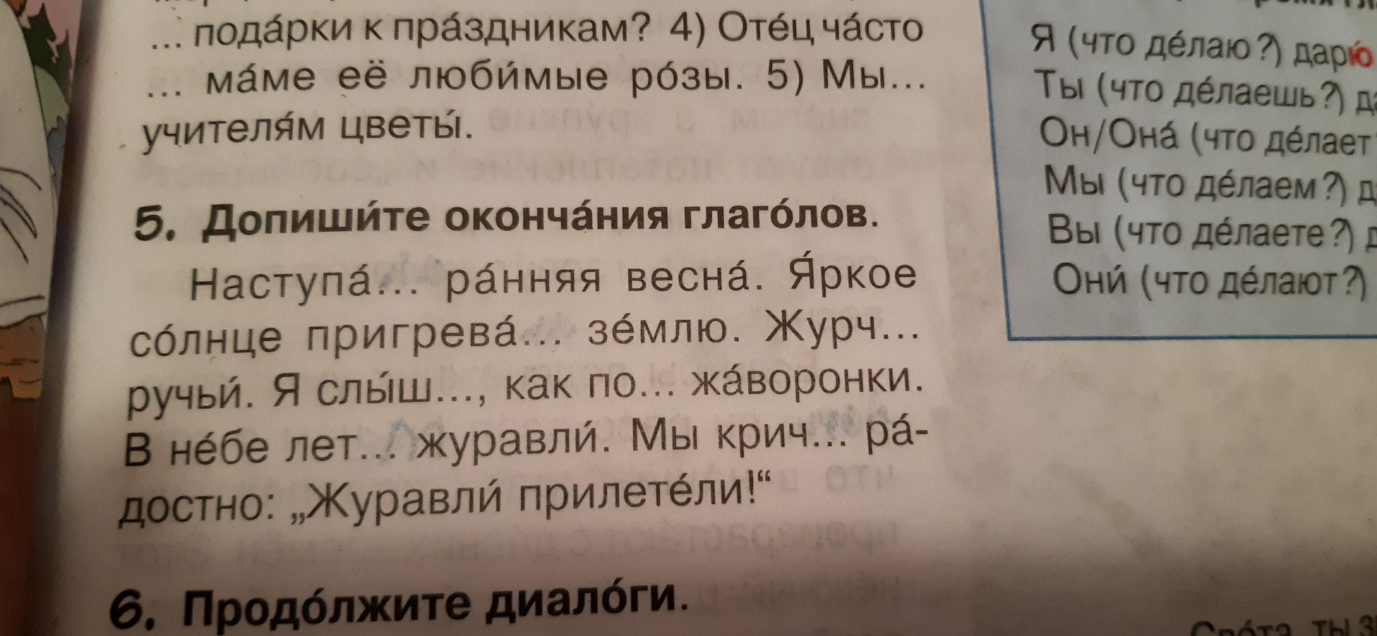 Наступала ранняя весна. Яркое солнце прогревало землю. Журчали ручьи. Я слышал , как покрикивают жаворонки. В небе летали журавли. Мы кричали радостно "Журавли прилетели"