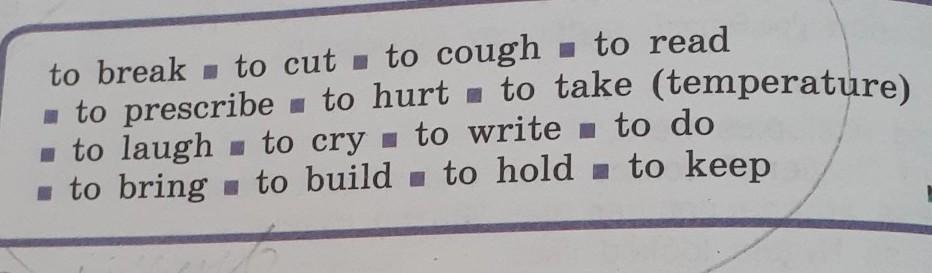 Объяснение:breaking a ice, cutting a cake, coughing in hospital, reading a book, prescribing in notebook, taking a cold, laughing with friend, crying in home, writing a text, doing party, bringing joy, building a house, holding a book, keeping secret