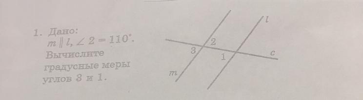 угол 3 и угол 1 равны углу2. то есть 110°. угол 3 и угол 2 вертикальные. так как m и l параллельны и проходят через прамую c, угол 1 будет равным углу 2( угол 1 и угол 2 -внутре меняющиеся)