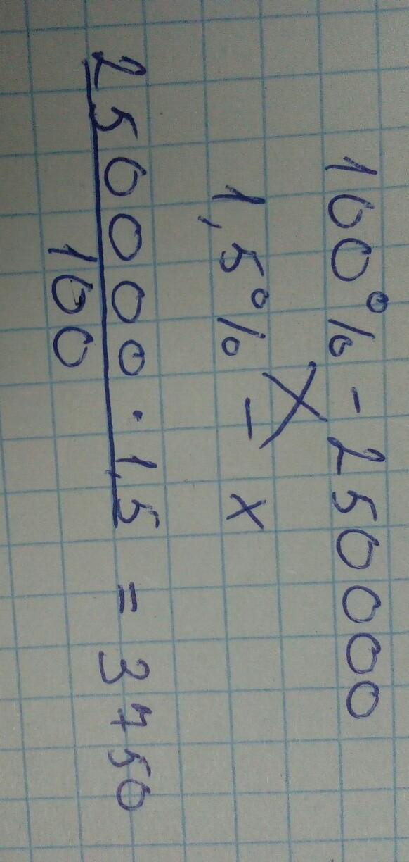 При снятии денежных средств с банковскова счета взимается комиссия 1,5% от суммы . Сколько рублей составит комиссия если сумма 250000