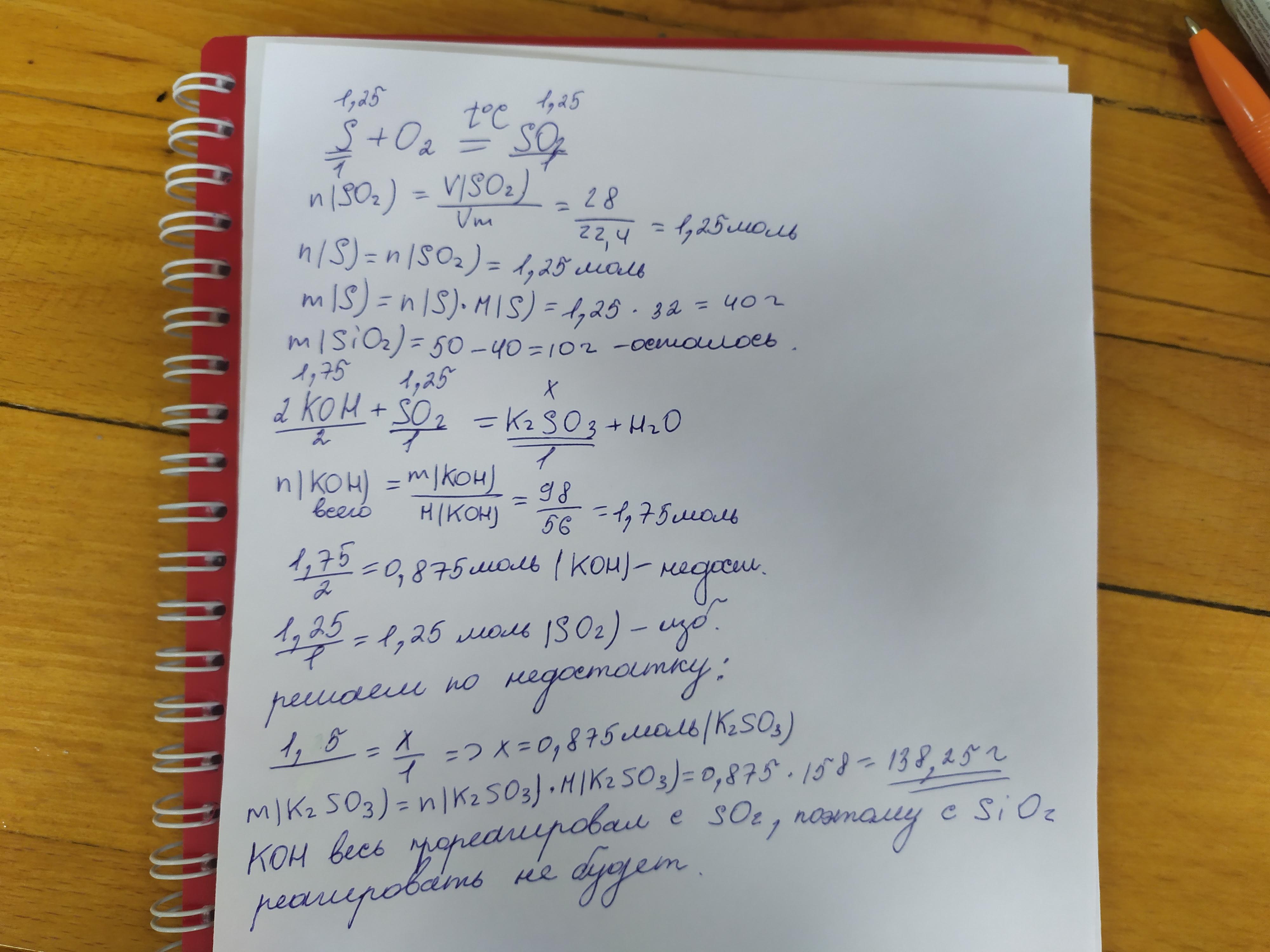 Во время окисления 50 г серы, содержит примеси песка, получили 28 л серы (4) оксида (н.у.), который пропустили через раствор щелочи, в котором содержалось 98 г калий гидроксида. Вычислите массу средней соли, образовавшейся в растворе.