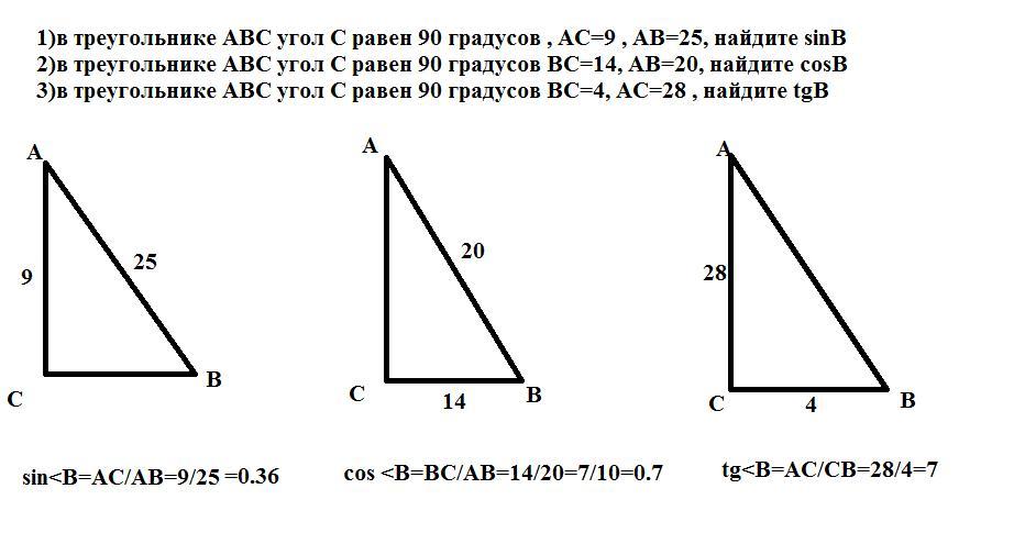 3)в тругольнике ABC угол C равен 90 градусов BC=4, AC=28 , найдите tgB