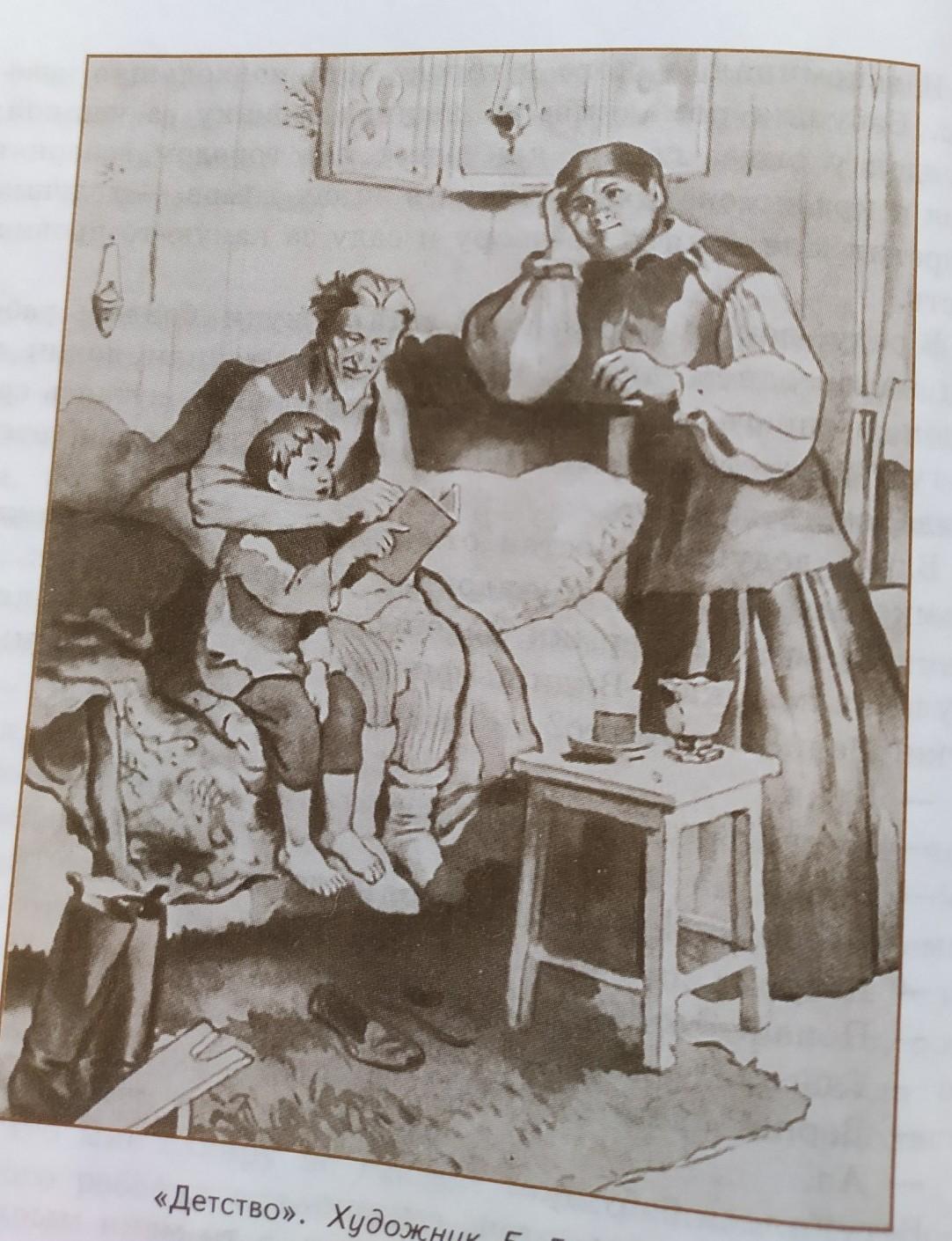 Картина очень уютная.Детство это самое беззаботное время.На ееднем плане картины мы видим как дедушка читает сказку,а мальчик с интересом слушает его.Также его слушает и бабушка.Рядом стоит табуретка, на которой стоит вкусная бабушкина еда.На стене висят иконы и картины.Также светло светит лампа