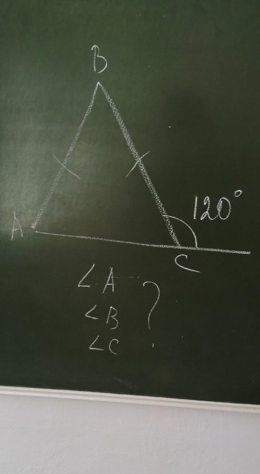Треугольник равнобедренный по определению, углы при основании равны, угол смежный с С 120 значит значит С 60 градусов следовательно треугольник равносторонний А,В,С равны 60
