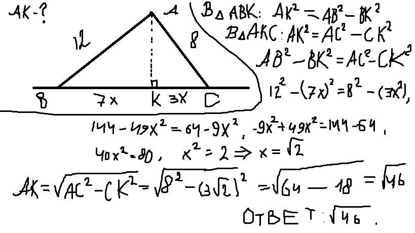 З точки до прямої проведено дві похилі , довжини яких дорівнюють 12 см і 8 см. Знайдіть відстань від точки до прямої, якщо проекції похилих на цю пряму відносяться як 7:3