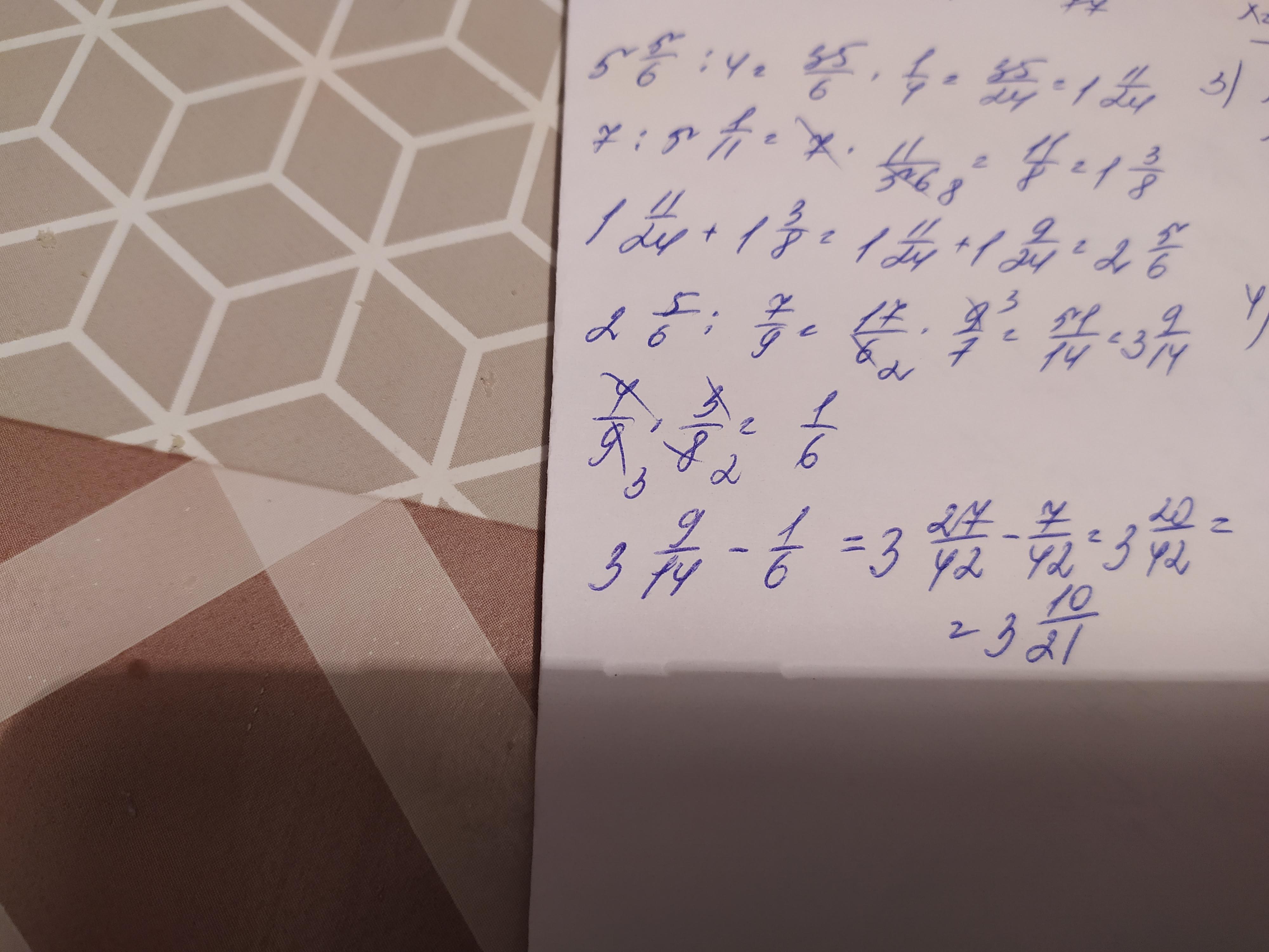 Выполните действия (5 5/6 :4+7:5 1/11):7/9-4/9*3/8