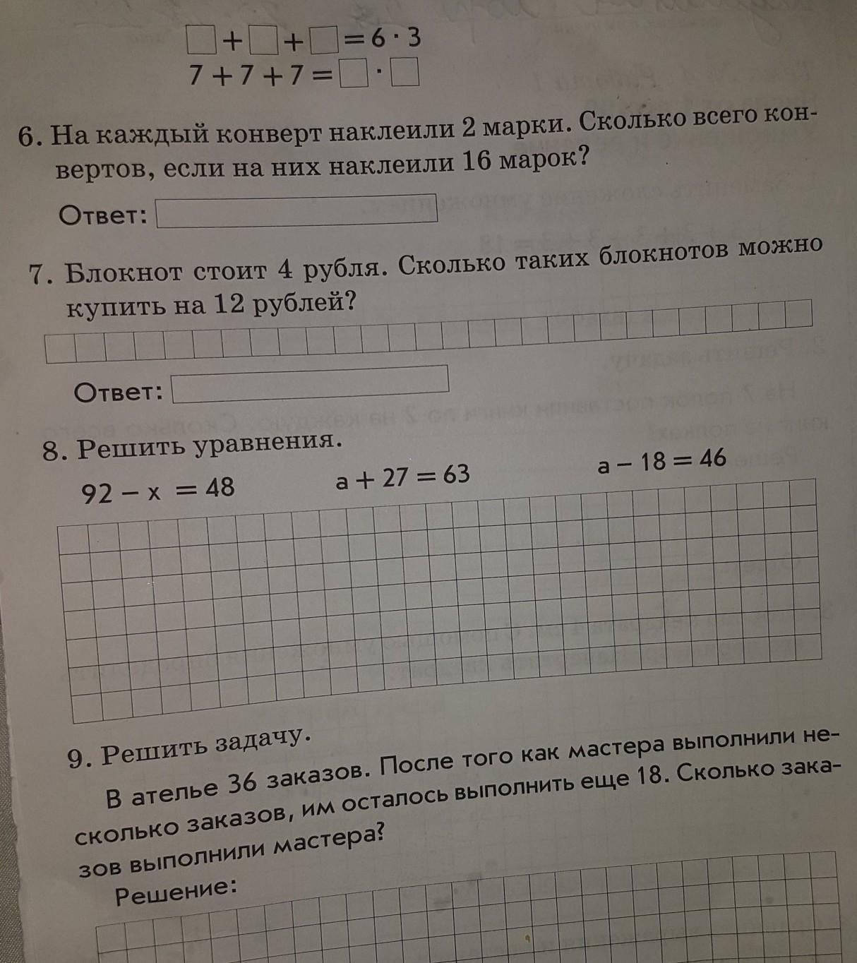 Номер семь 12÷4=3 блокнота. Номер восемь первое х=92-48. х=44. Второе а=63-27. а=36. Третье а=46+18. а=64. Номер девять 36-18=18заказов осталось