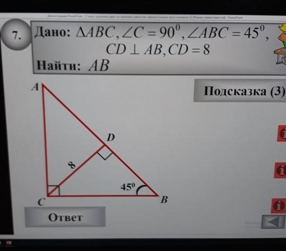 Оскільки трикутник рівнобередний то CD - медіана, бісектриса і висота. Тому кут ACD =45.За tg знаходимо AB. TgACD=AD/CD.AD=tg45*CD=1*8=8.AB=2*8=16