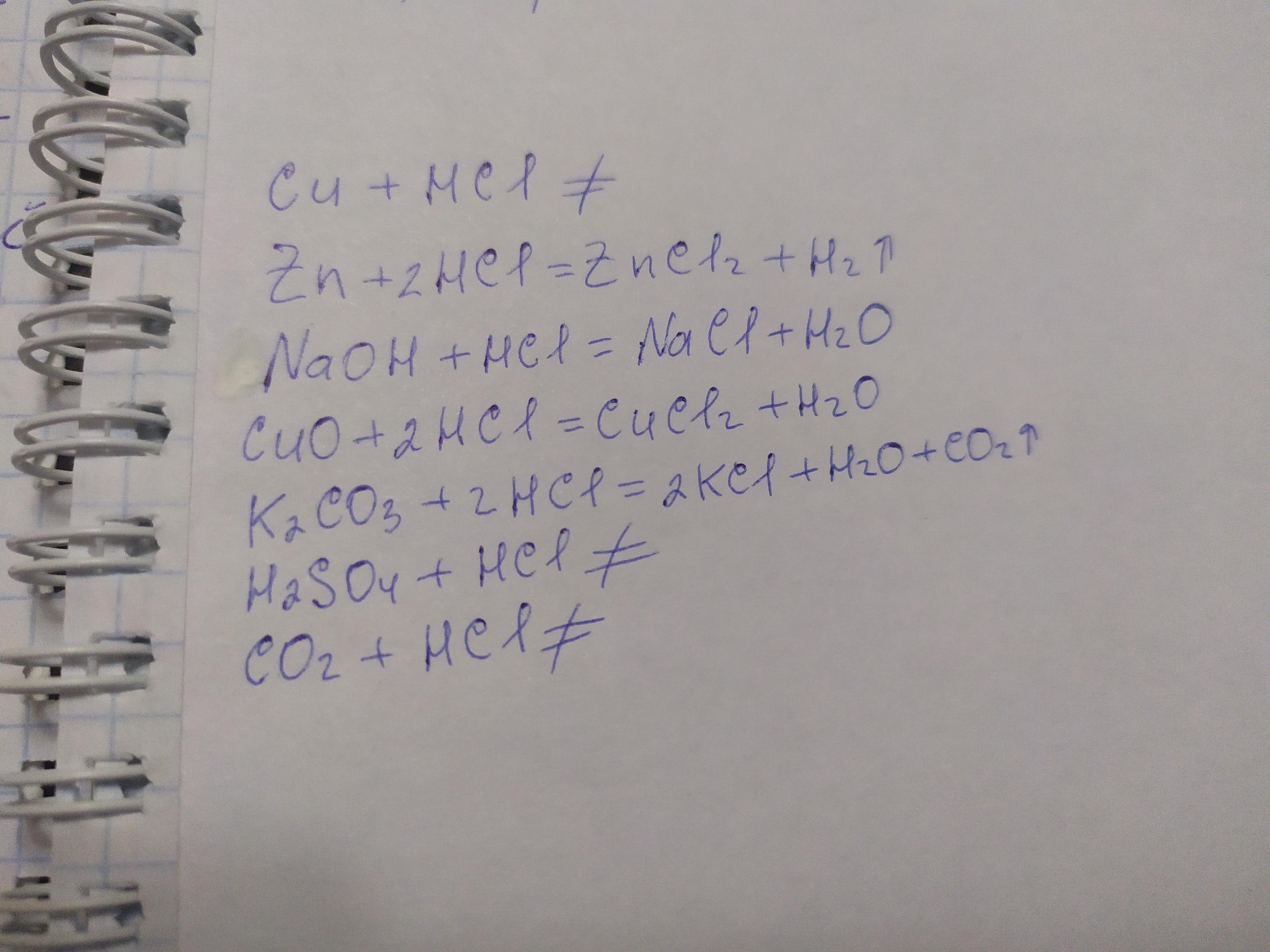 Даны вещества: Cu, Zn, NaOH, CuO, K2CO3, H2SO4, CO2. Укажи количество возможных реакций с участием соляной кислоты.