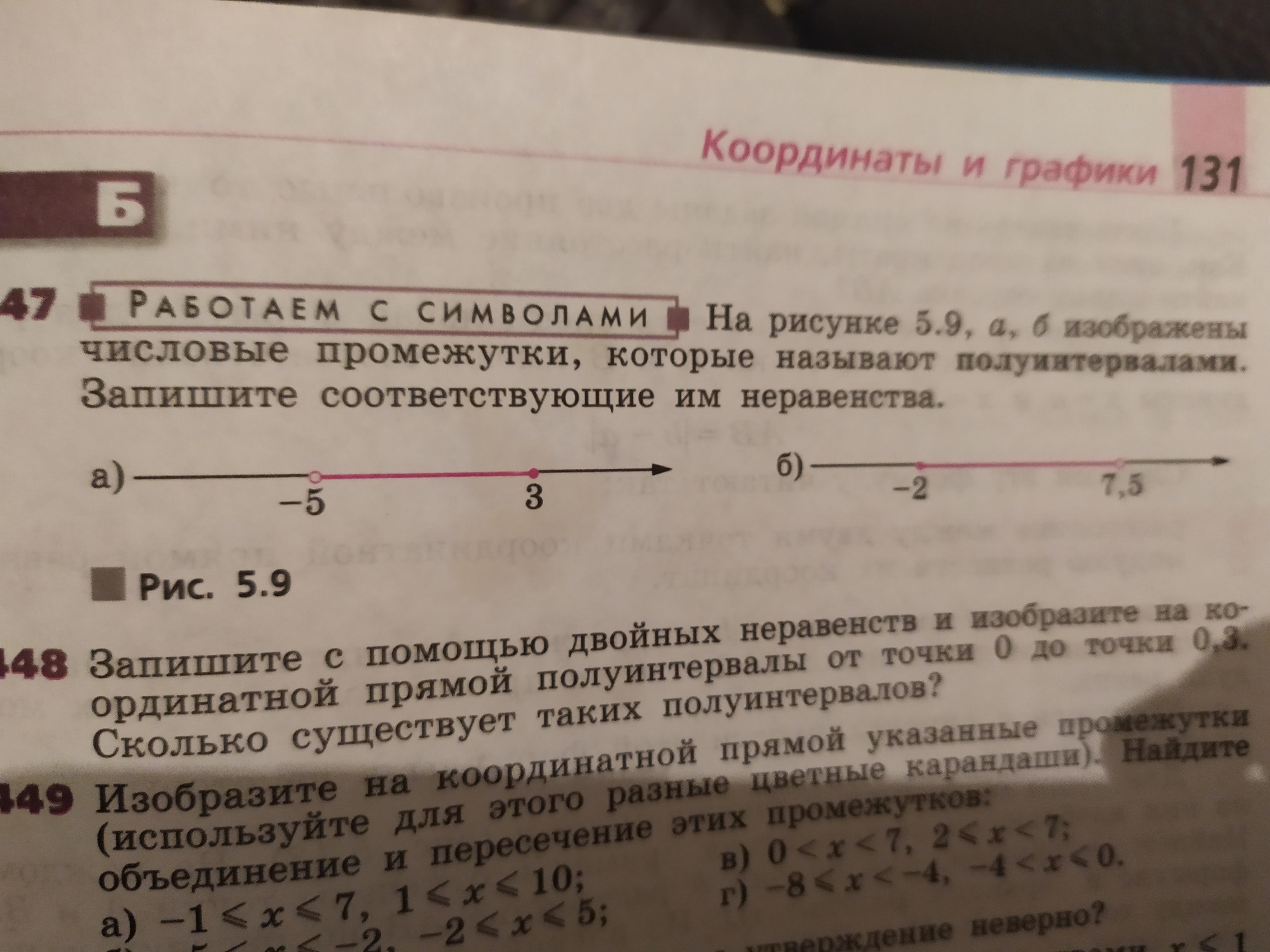 Помогите очень нужна помощь На рисунке 5.9 а б изображены числовые промежутки, которые называют полуинтервалами. Запиши соответствующие им неравенства.