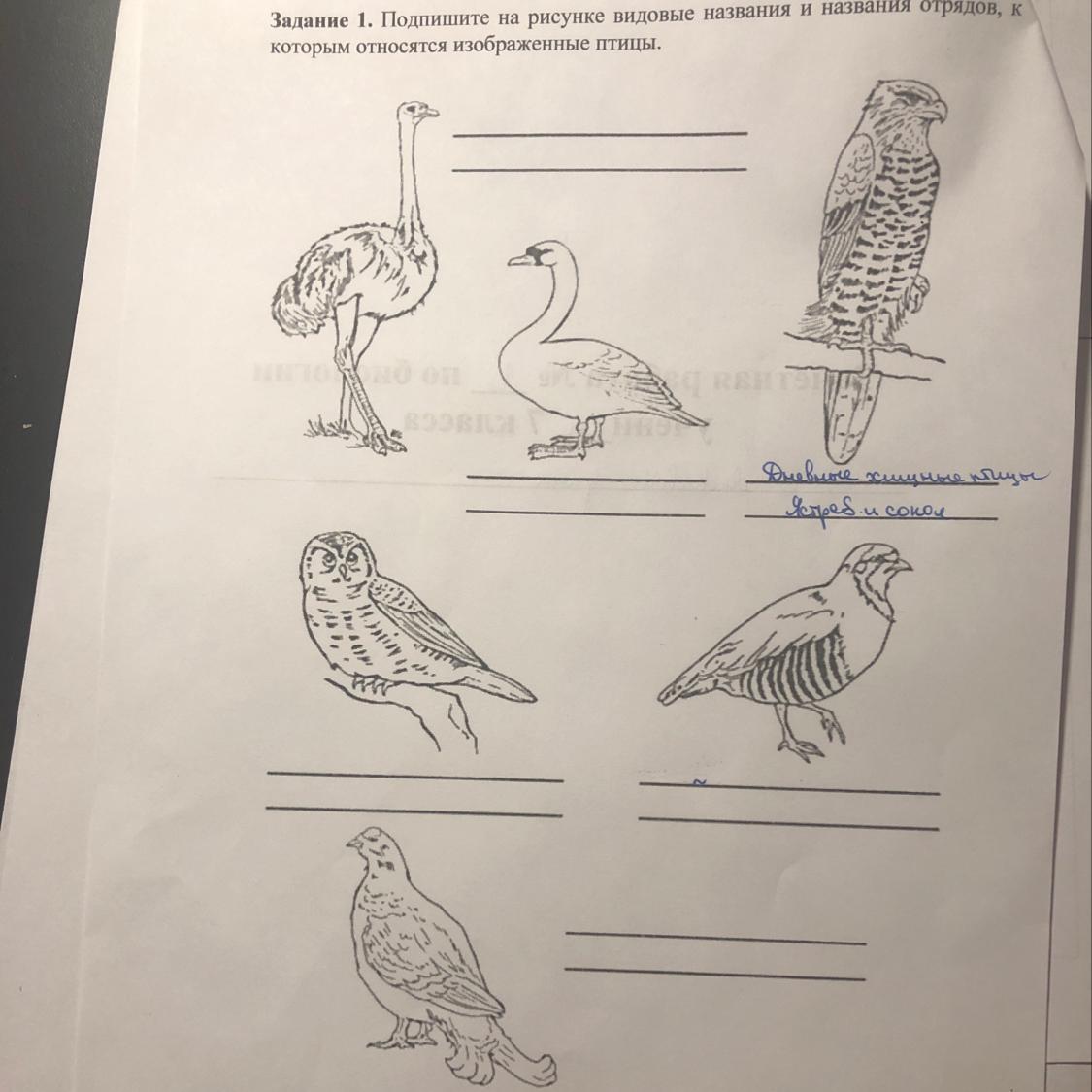 Подпишите на рисунке видовые названия и названия отрядов к которым относятся изображённые птицы