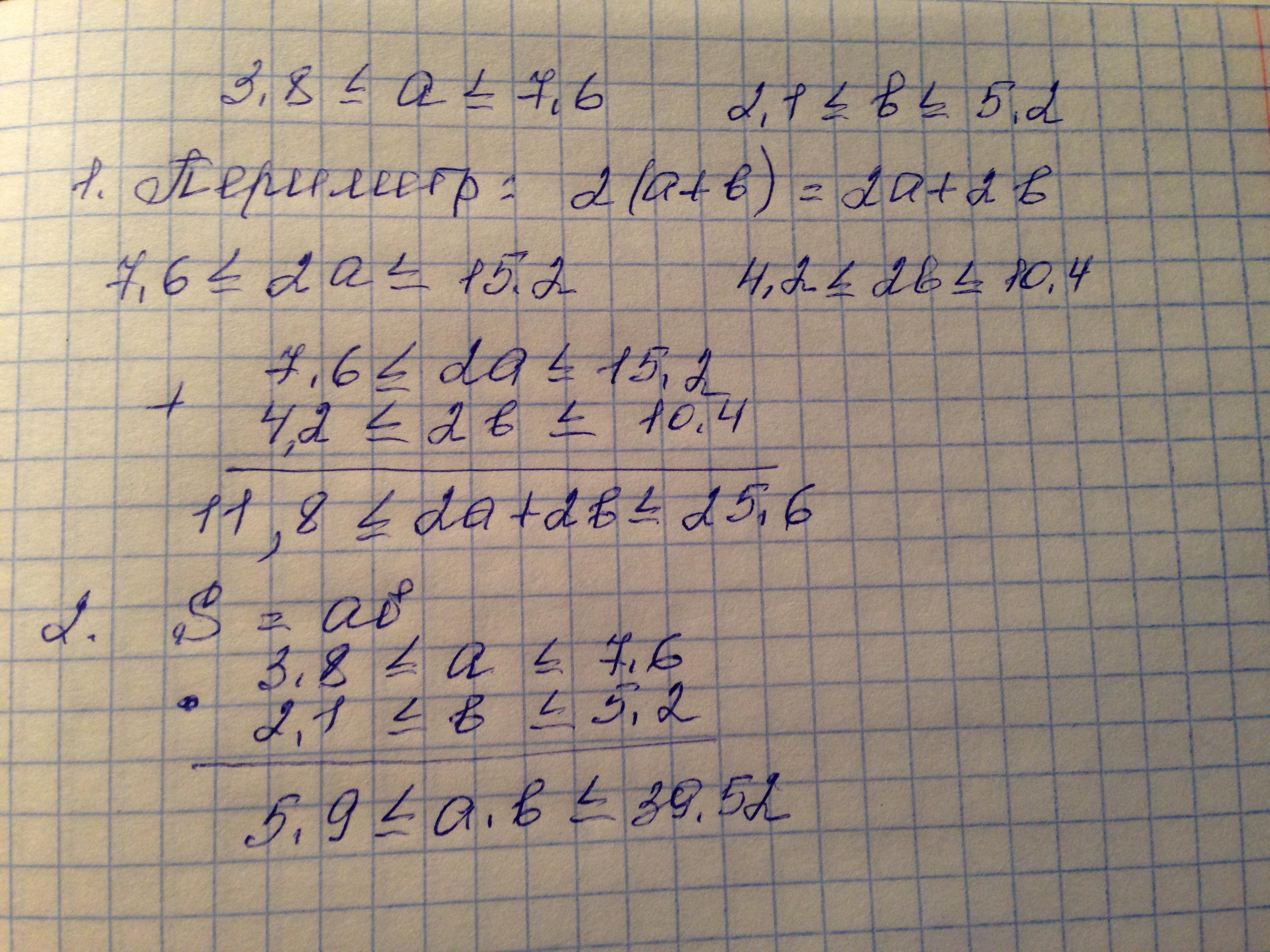 ОЦЕНИТЕ ПЕРИМЕТР И ПЛОЩАДЬ ПРЯМОУГОЛЬНИКА СО СТОРОНАМИ А И B СМ ГДЕ 3,8 МЕНЬШИ ИЛИ РОВНО А МЕНЬШЕ ИЛИ РОВНО 7,6 И 2,1 МЕНЬШЕ ИЛИ РОВНО B МЕНЬШЕ ИЛИ РОВНО 5,2