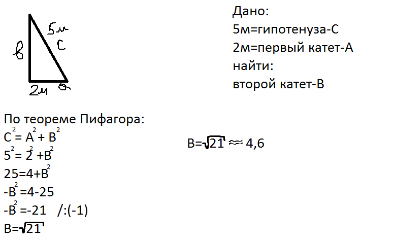 1. Основание лестницы находится в 2 метра от стены, длина лестницы 5 метров. На каком расстоянии от земли находится верхний конец лестницы?