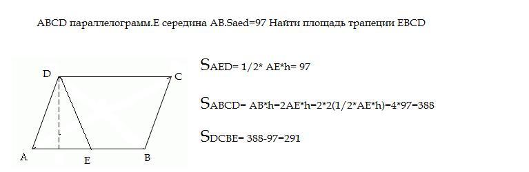 ABCD параллелограмм . E середина AB. S(AED)=97 .