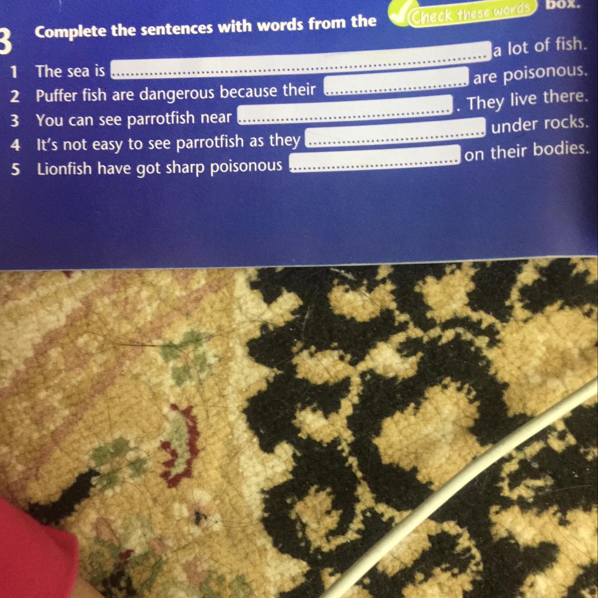 В флажке слова : home to millions unique poisonous spikes clumsy stomach colorful beak coral reefs hide rocks wear Puranas cover coat spines