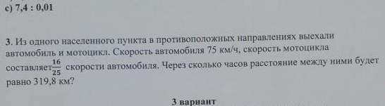 3) 319,8 : 123 = 2,6 (ч.) - время, через которое расстояние между мотоциклом и автомобилем будет 319,8 км.