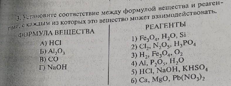 Установите соответствие между формулой вещества и реагентами ,с каждым из которых это вещество может взаимодействовать .