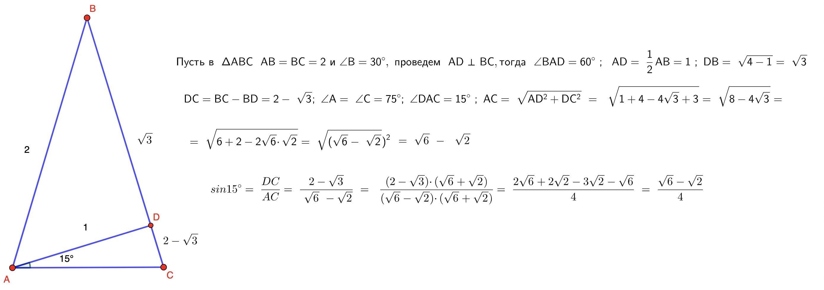 как найти синус угла равного 15 не используя тригонометрию и транспортира.