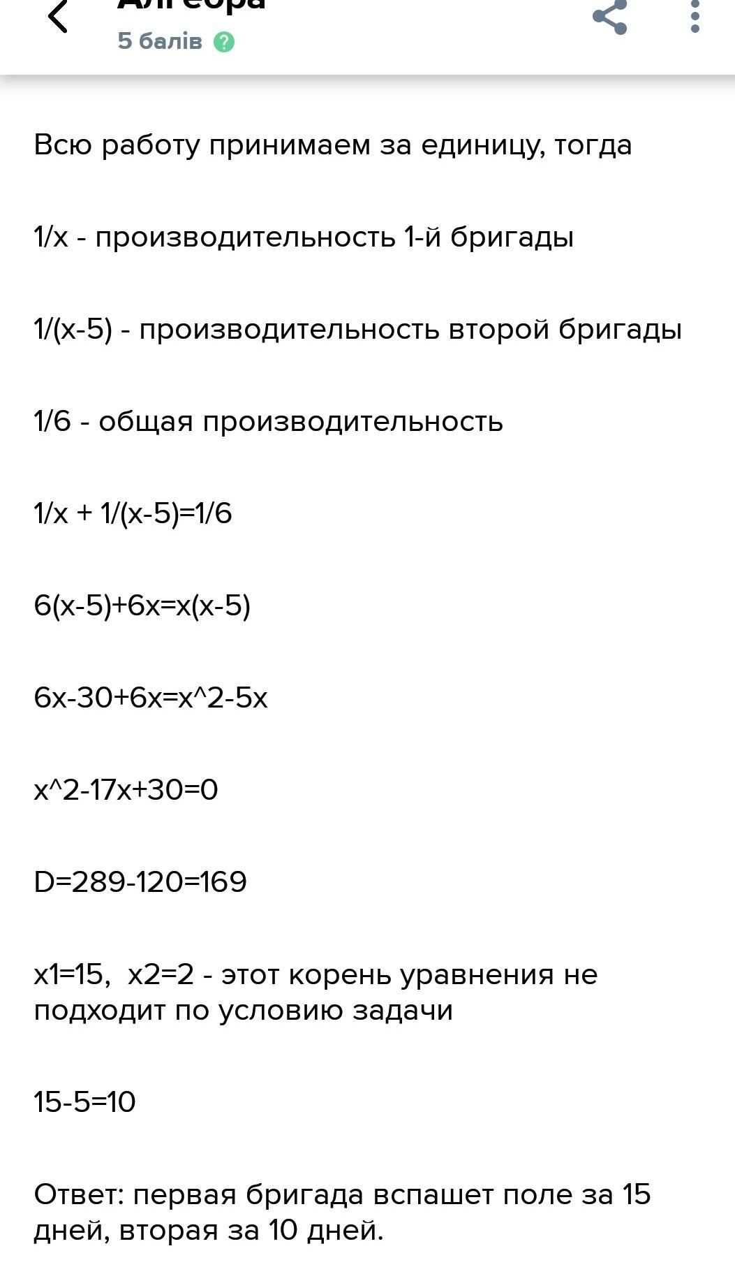 Дві бригади,працюючи разом, закінчили ремонт дороги за 6 днів. Скільки днів треба було б кожній бригаді на виконання цієї роботи, якщо одній з них для цього потрібно на 5 днів менше, ніж другій?