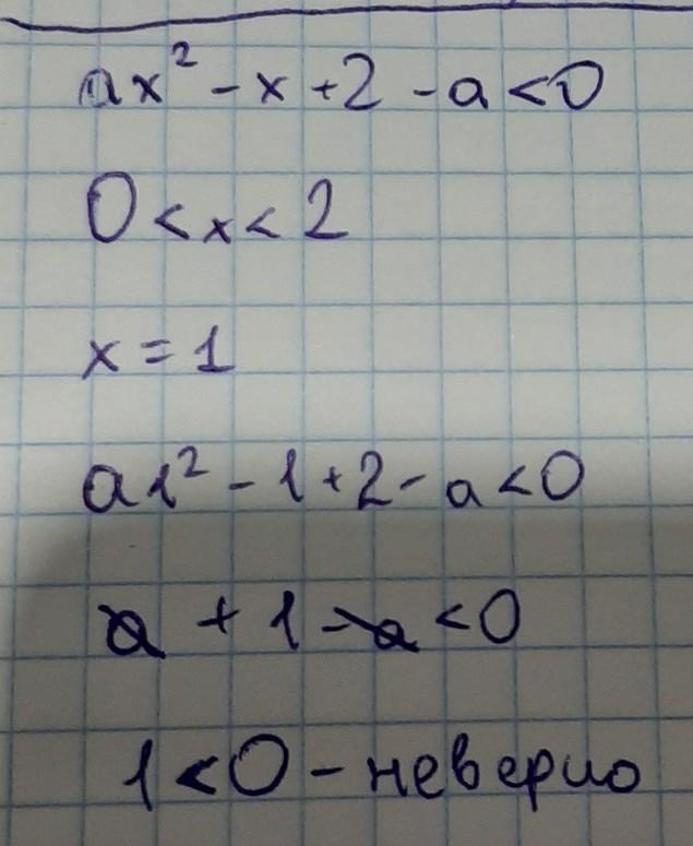Найдите все значения параметра а, при которых из неравенства ах^2-х+2-а<0, следует неравкнство 0<х<2