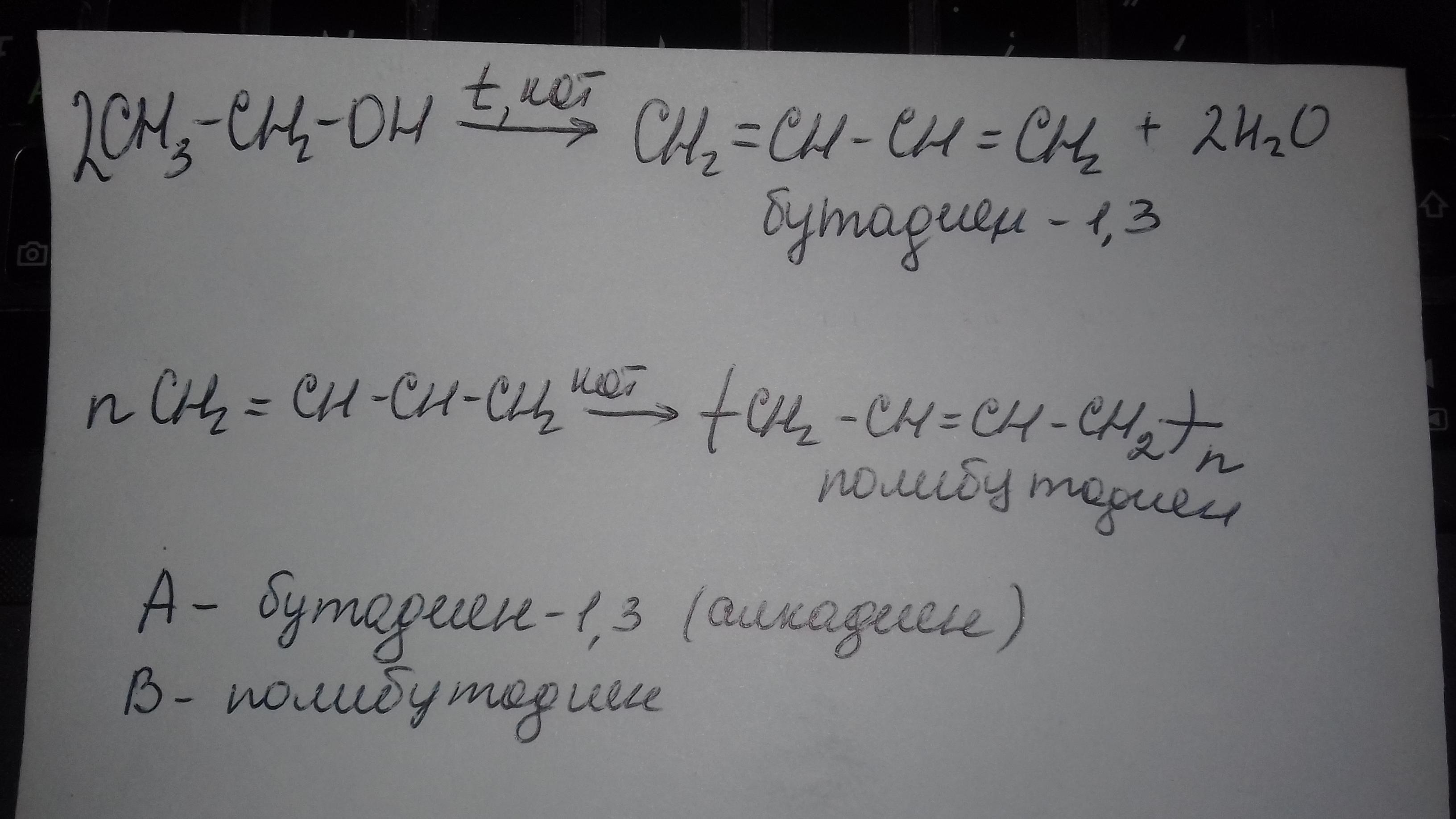 этанол (усл. 450°С, AL2O3,ZnO)→A(полимеризация)→В