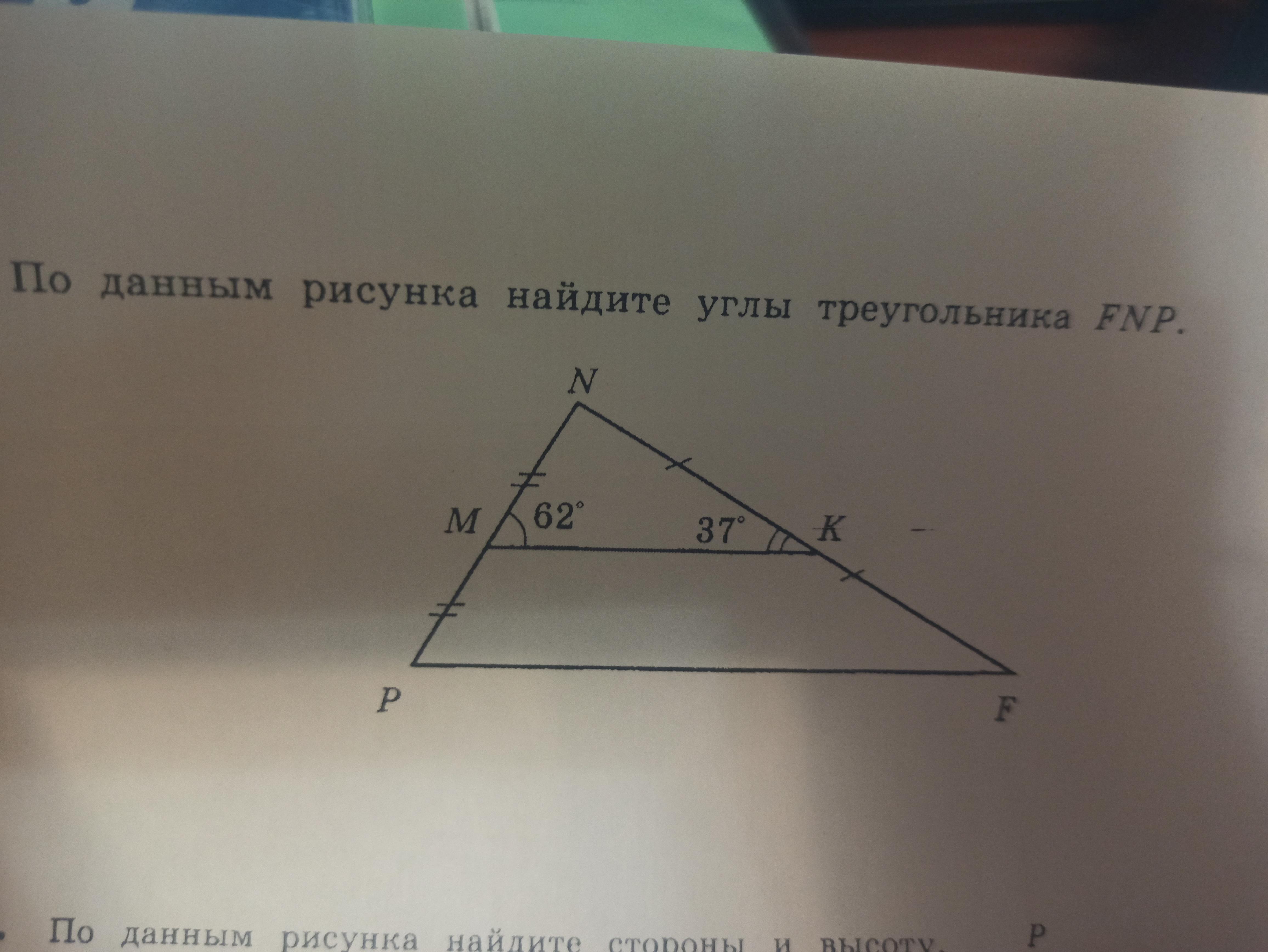 по лемме о подобных треугольниках, треугольники MNК и PNF подобны, значит, их углы соответственно равны, то есть, угол NMK = угол NPF = 62°, а угол NKM = угол NFP = 37° (угол N = 180°-62°-37°=81°)
