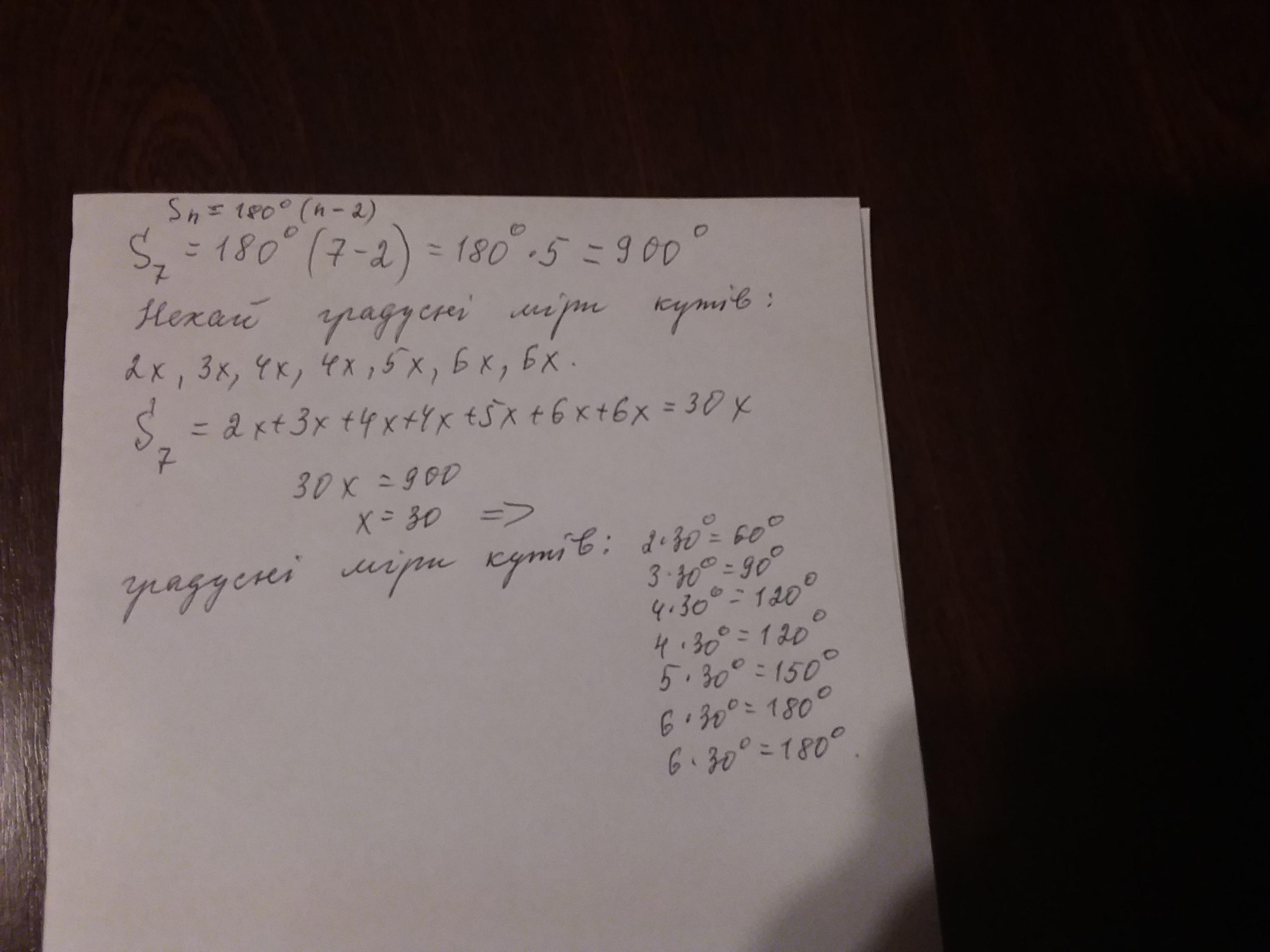 Знайдіть велечини внутрішніх кутів опуклого семекутника якщо їхні градусні міри відносяться 2:3:4:4:5:6:6