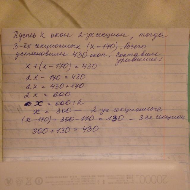 В новом доме устанавливают пластиковые окна. Всего установили 430 пластиковых окон, причём трёхсекционных на 170 штук меньше, чем двухсекционных. Сколько пластиковых окон каждого вида установили?