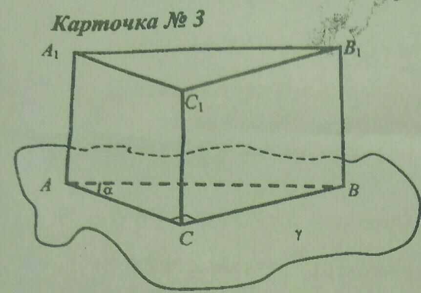 В основании прямой призмы лежит прямоугольный треугольник ABC с острым углом а и гипотенузой с. Найдите угол, образованный плоскостью нижнего основания призмы и плоскостью, проходящей через катет АС и вершину B1 верхнего основания, если высота призмы