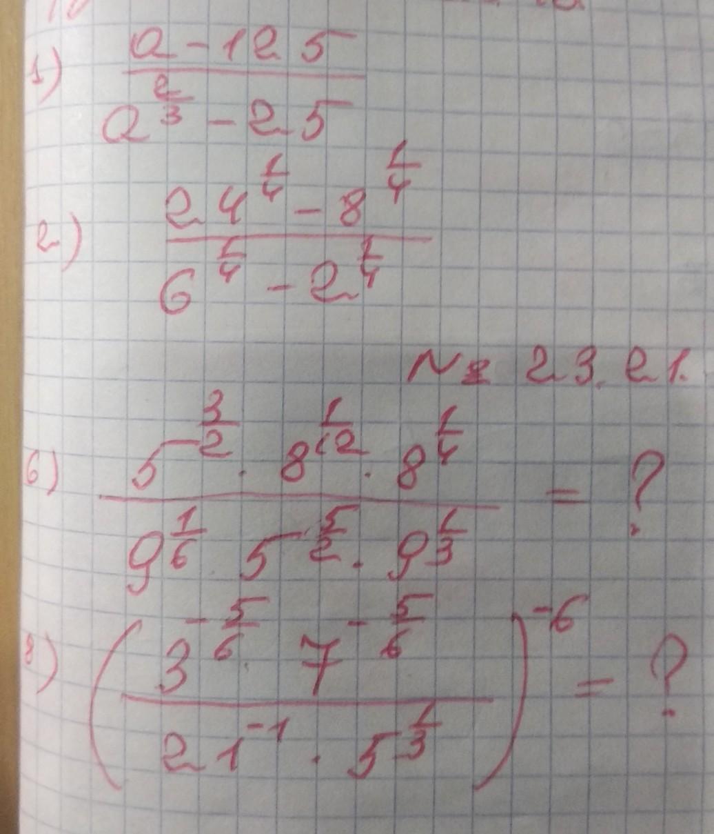 4); ; Big(frac{3^{-5/6}, cdot , 7^{-5/6}}{21^{-1}, cdot , 5^{1/3}}Big)^{-6}=Big(frac{21^{-5/6}, cdot , 21}{5^{1/3}}Big)^{-6}=frac{21^{5}, cdot , 21^{-6}}{5^{-2}}=frac{21^{-1}}{5^{-2}}=frac{5^2}{21}=\\=frac{25}{21}=1frac{4}{21}