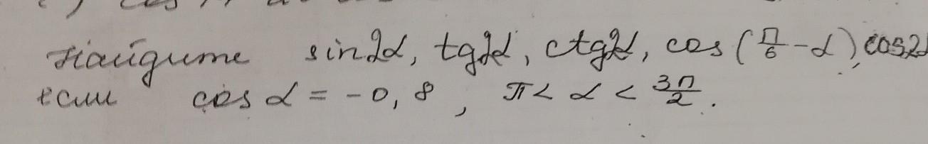 cosα=-0,8 π<α<3π/2 sin(2α)=? tg(2α)=? ctg(2α) cos(π/6-α)=?, cos(2α)=?