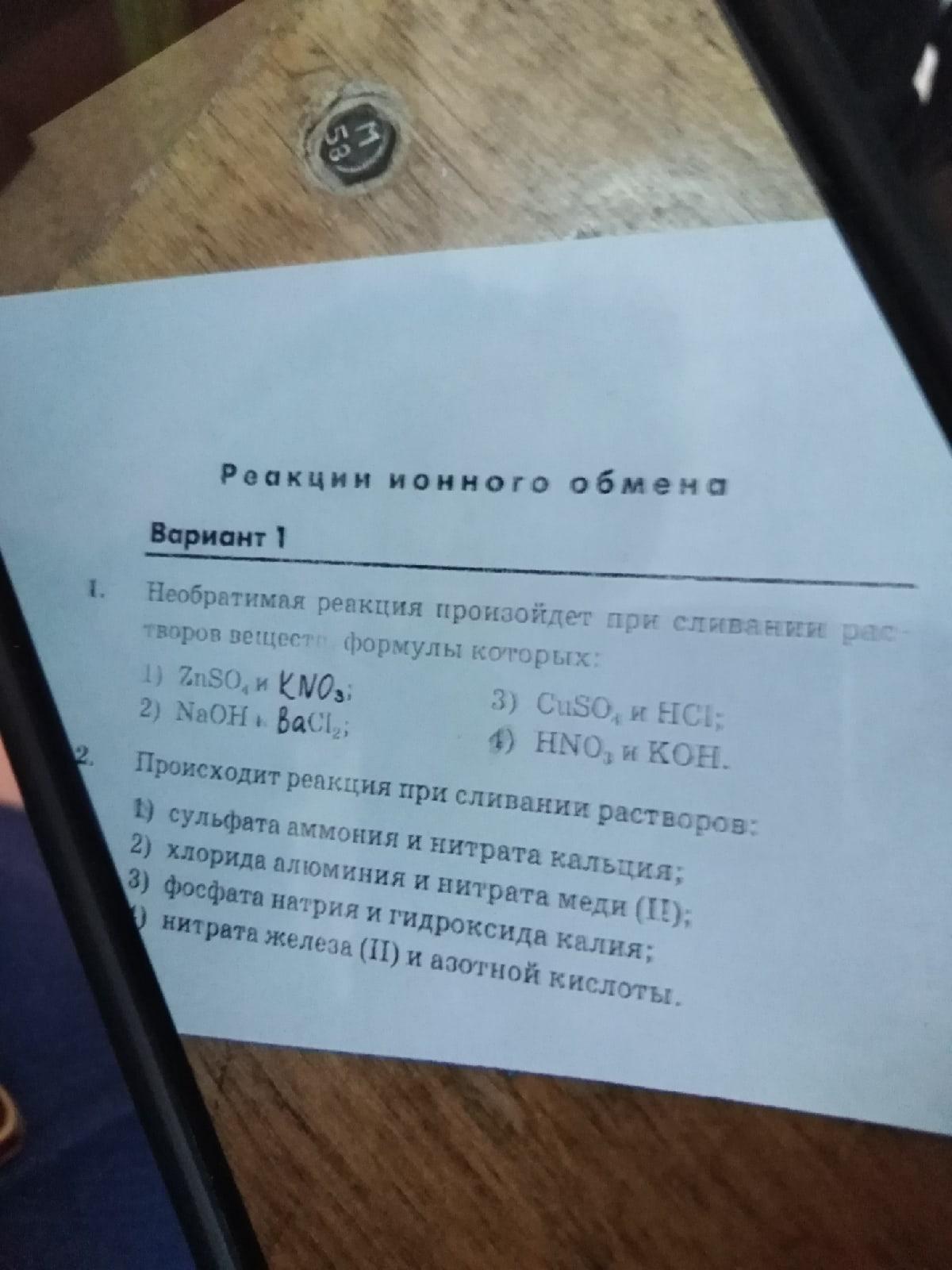 Необратимая реакция произойдет при сливании растворов веществ,