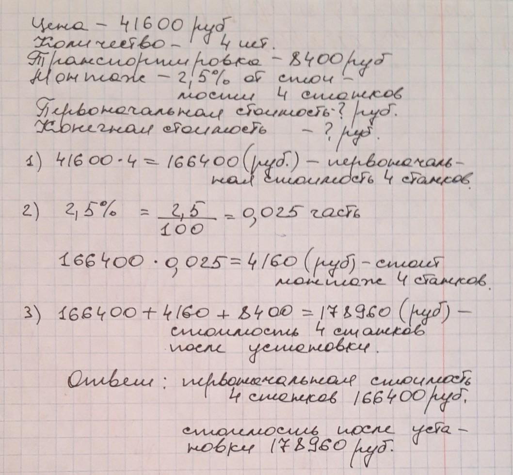Определите первоначальную стоимость 4 станков, если известно, что приобретен станок по цене 41600 руб. , общие затраты на транспортировку составили 8400 руб. общие затраты на монтаж 2,5% от стоимости.