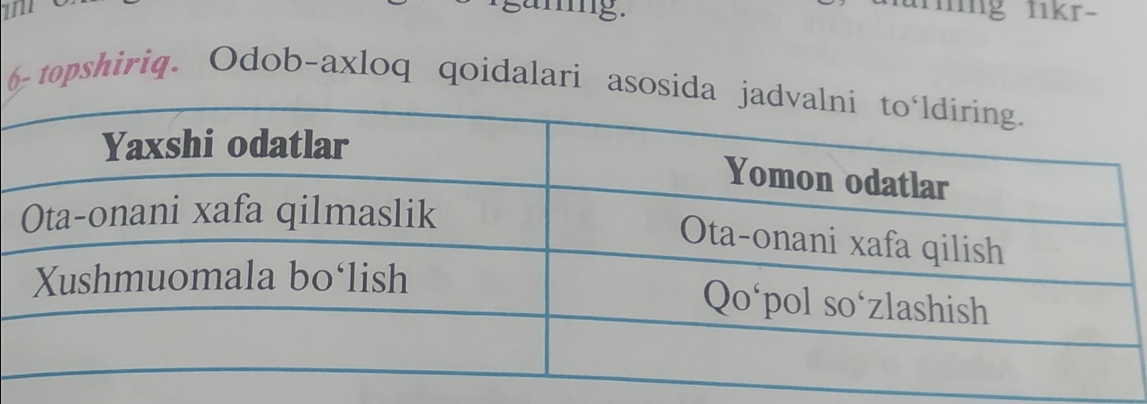 Yomon odatlar:kech uyqudan turish, yolg'on gapirish, ota-onaga uy ishlarida yordam bermaslik, janjal qilish, qichqirish.....