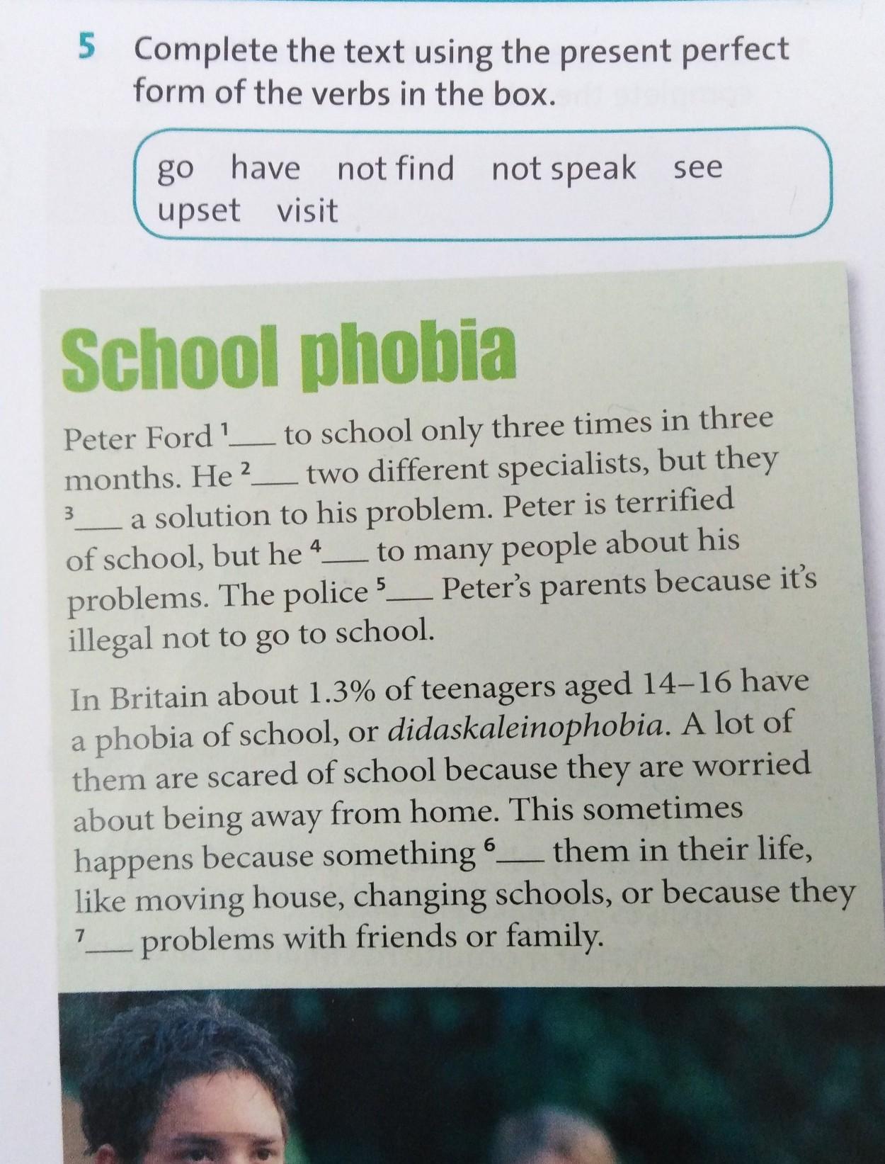 Peter Ford has gone¹ to school only three times in three months. He has seen² two different specialists, but they haven't found³ a solution to his problem. Peter is terrified of school, but he hasn't spoken⁴ to many people about his problems. The police has visited⁵ Peter's parents because it's illegal not to go to school.