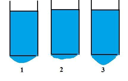 4. Нижние отверстия одинаковых трубок, 1, 2, 3, заполненных жидкостью затянуты тонкой резиновой пленкой. В какой трубке плотность жидкости наибольшая? Картинка снизу. 1. Во всех трубках одинакова. 2. В 1-й. 3. Во 2-й. 4. В 3-й.