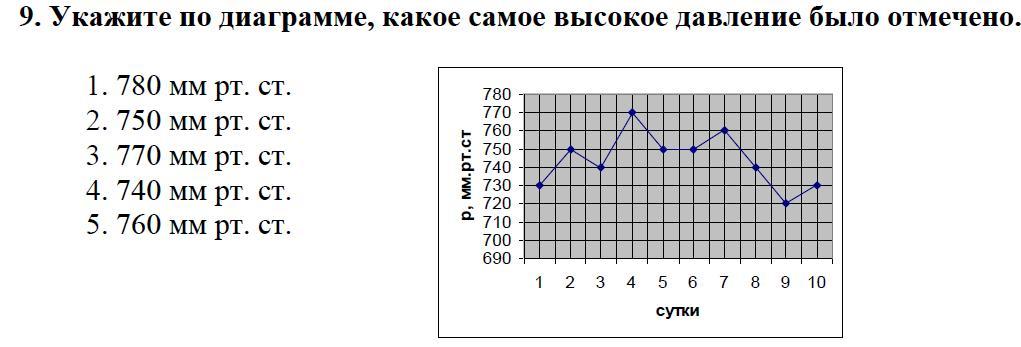 8. В течение нескольких суток в одно и то же время отмечалось атмосферное давление, и по полученным данным построена диаграмма. В какой из дней наблюдалось самое низкое давление? Картинка снизу.