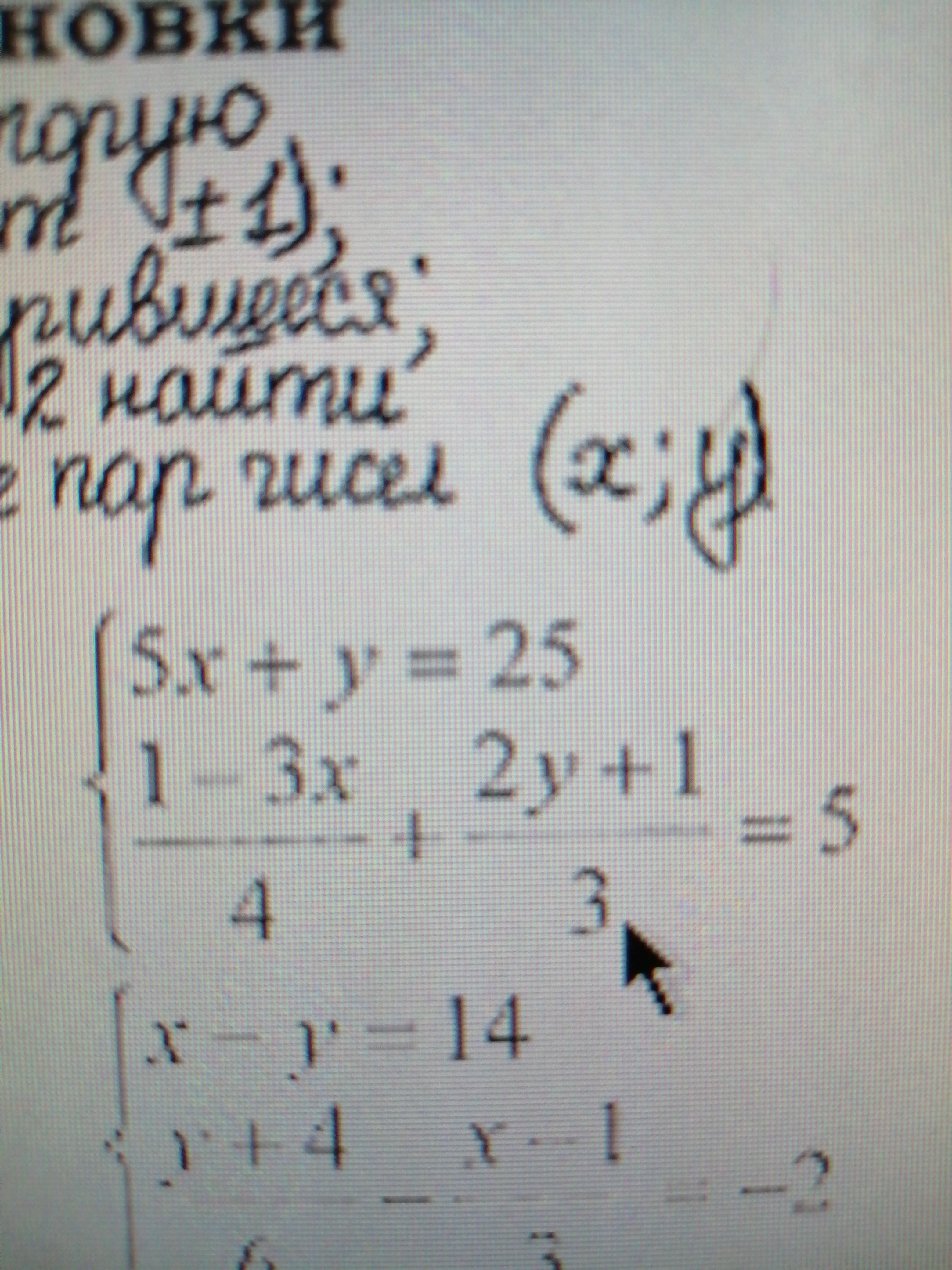 Второе уравнение (1 - 3 * 3) /4 + (2 * 10 + 1) /3 = так же общий знаменатель 12, получим: (-8 * 3) + (21 * 4) всё делённое на 12 =