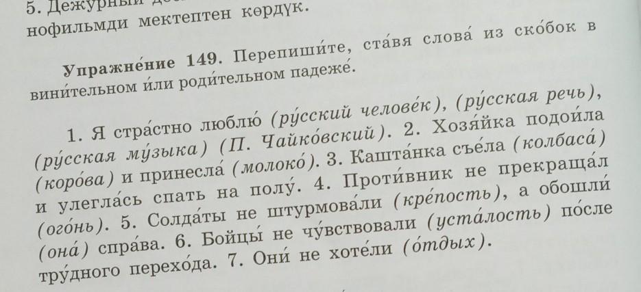 1 Русского человека, русскую речь, русскую музыку 2 корову, молока 3 колбасу, 4 огонь 5 крепость, её 6 усталости,7 отдыха