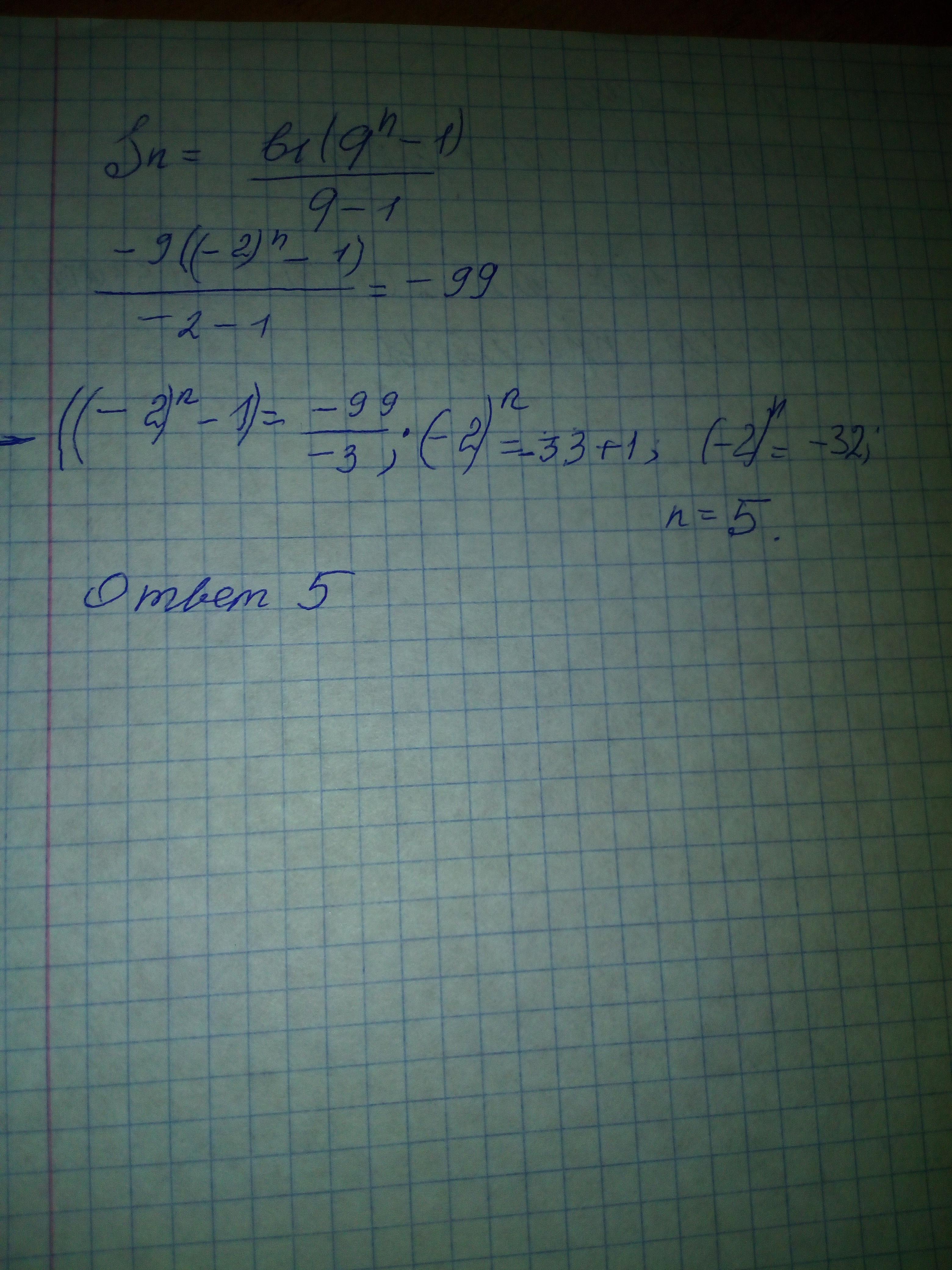 Найдите количество членов геометрической прогресии bn, если b1=−9, q=−2, Sn=−99.