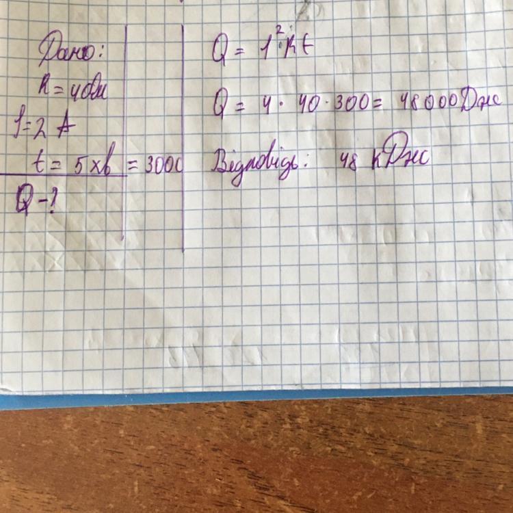 В нагревательном элементе сопротивление 40 Ом, сила тока 2 А. Какое количество теплоты выделится в нём за 5 минут?