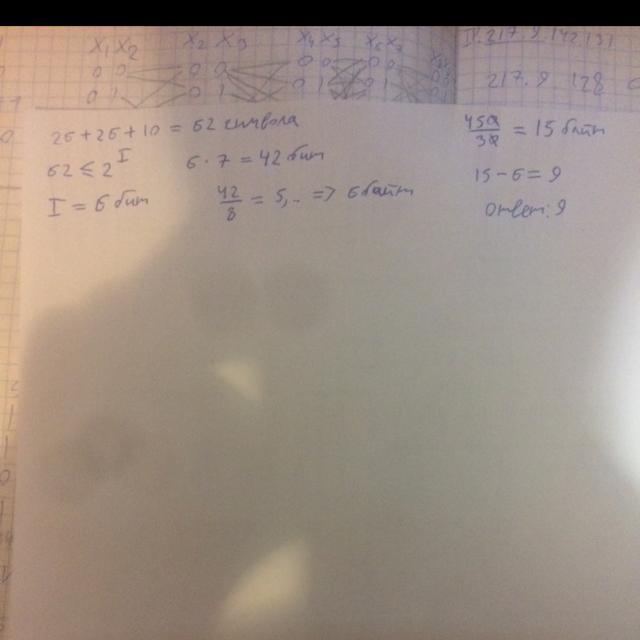 При регистрации в компьютерной системе каждому пользователю выдаётся пароль, состоящий из 7 символов. Из соображений информационной безопасности каждый пароль должен содержать как прописные, так и строчные латинские буквы, а также хотя бы 1 десятичную цифру. В базе данных для хранения сведений о каждом пользователе отведено одинаковое и минимально возможное целое число байт. При этом используют посимвольное кодирование паролей, все символы кодируют одинаковым и минимально возможным количеством бит. Кроме собственно пароля, для каждого пользователя в системе хранятся дополнительные сведения, для чего выделено целое число байт; это число одно и то же для всех пользователей.