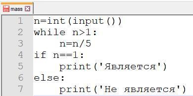 - Для начала сам алгоритм. С самого начала пишем: 'Пока n больше 1 - делим его на 5' (2 - 3 строка)