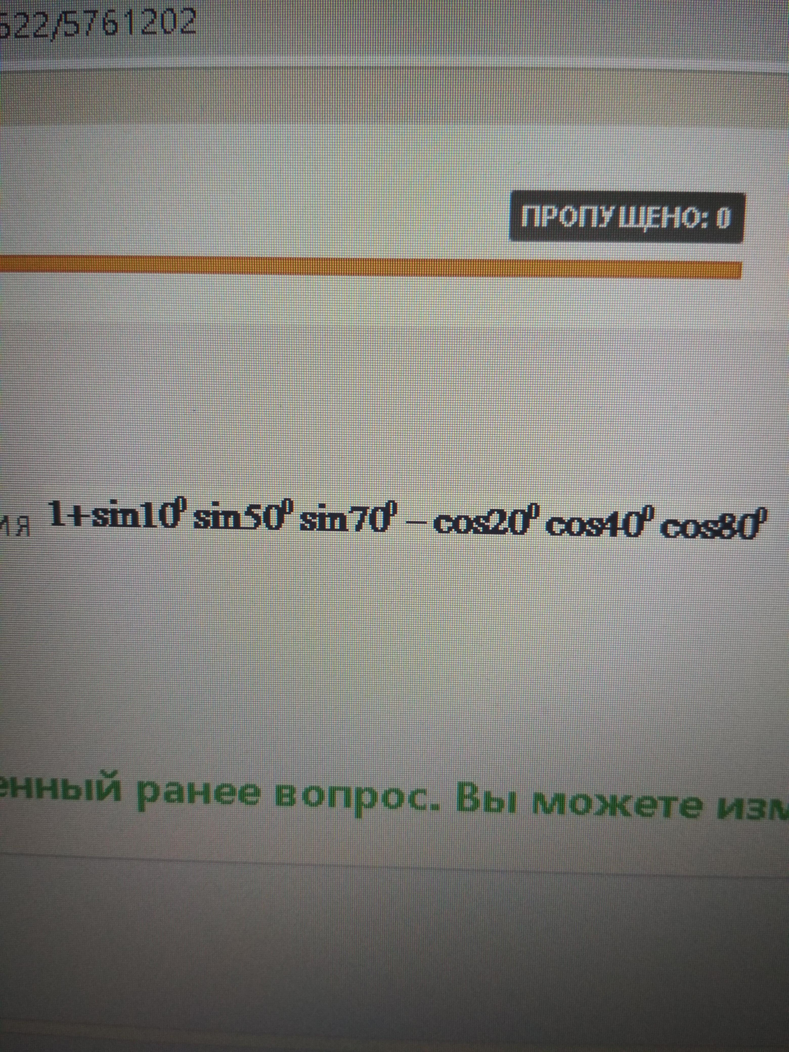 1+Sin10^{o}Sin50^{o}Sin70^{o}-Cos20^{o}Cos40^{o}Cos80^{o}=1+Sin(90^{o}-80^{o})Sin(90^{o}-40^{0})Sin(90^{o}-20^{o})-Cos20^{o}Cos40^{o}Cos80^{o}=1+Cos20^{o}Cos40^{o}Cos80^{o}-Cos20^{o}Cos40^{o}Cos80^{o}=1